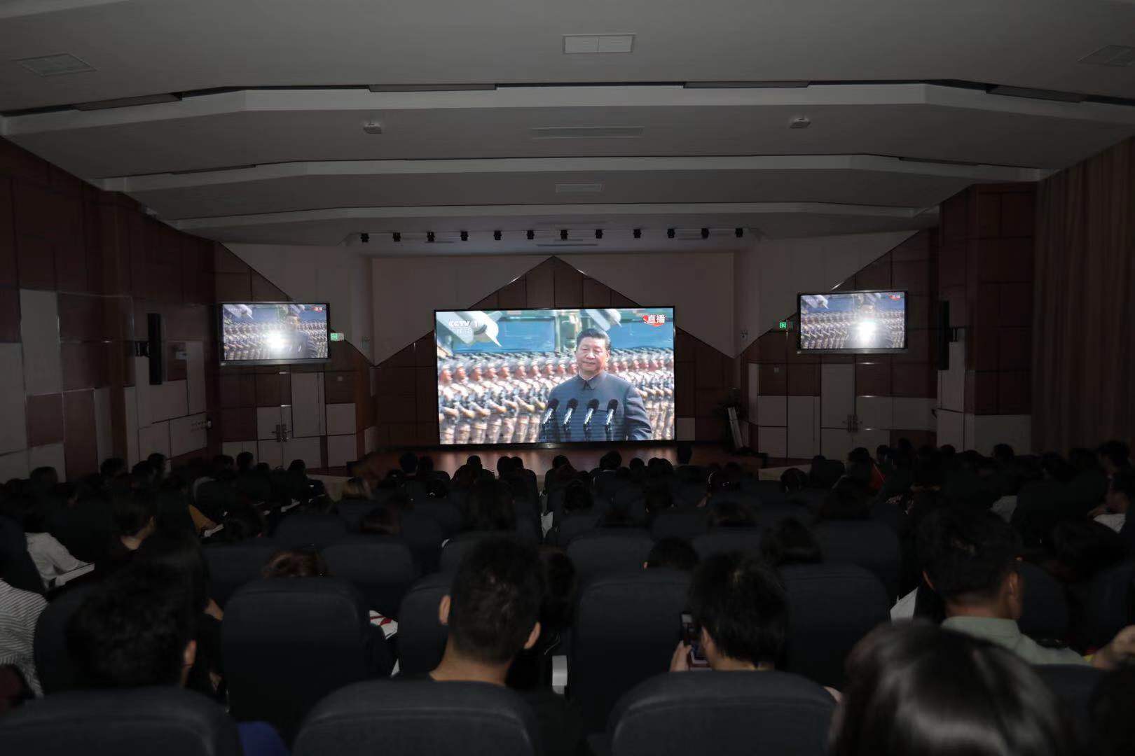 全场座无虚席,还有未报上名的学生加座前来观看。大家认真聆听了习近平总书记在庆祝中华人民共和国成立七十周年大会上的重要讲话,激动地观看了阅兵盛典,纷纷为新中国七十年来取得的辉煌成就感到自豪。