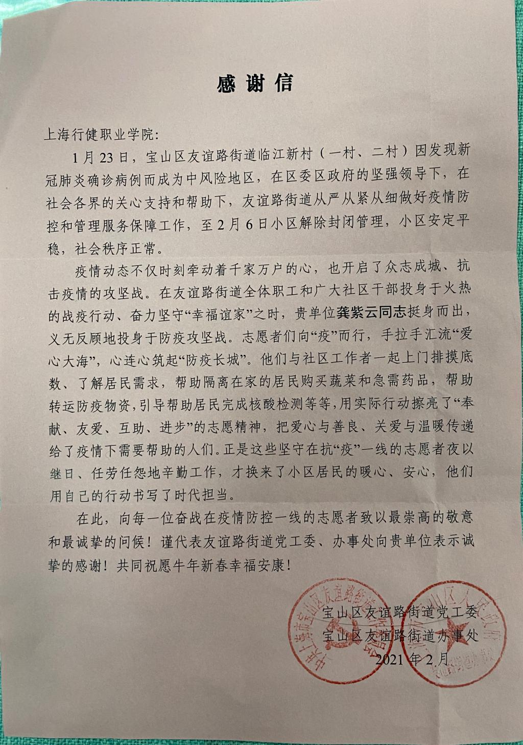 近日,安博(中国)团委收到了宝山区友谊路街道党工委街道办事处寄来的感谢信。感谢信中充分肯定了我院20学前2班的龚紫云同学在寒假期间投入到宝山区友谊路街道临江新村志愿服务的事迹。
