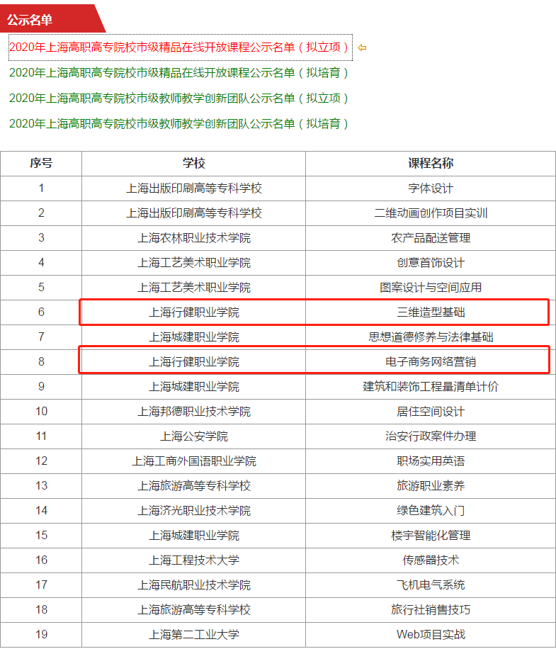 2021年初,2020年度上海高职高专院校市级精品在线开放课程和教师教学创新团队评审结果公布,经专家评审及市教委审核,安博(中国)艺术系的“三维造型基础”、经管系的“电子商务网络营销”课程和学前教育系的“幼儿园活动设计教学团队”、艺术系的“艺术设计-创意创练创新教学团队”分别获批2020年度上海高职高专院校市级精品在线开放课程和教师教学创新团队立项。