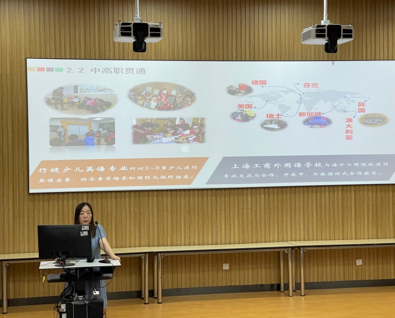 在教师交流环节,少儿英语专业组长宋婕老师呈现了专业八年来的发展情况,在师资融通、课程共建、教学见习实习等方面与吉的堡开展深度校企合作,形成“英语+少儿英语教学技能+教学管理”的专业特色,并与上海工商外国语学校进行中高职贯通人才培养。软件技术专业组长东苗率先开展了1+X证书试点,师生参加职业技能大赛斩获从上海市第一名到三等奖的不同奖项,软件技术专业还与上海信息技术学校开展大数据应用与管理的中高职贯通培养,在校企合作、院级优质课程建设等方面也取得了一定成绩。