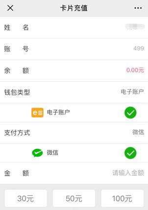 “卡片充值”应用,可自行输入需要充值金额或点选对应充值金额点击“确认充值”按钮进行微信充值。充值成功后不能退款。