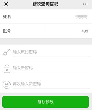 “密码修改”应用,用户可以自行修改查询密码,先输入原始密码,再输入新密码,点击“确认修改”按钮完成修改。