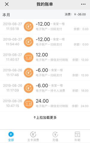 “我的账单”应用,可查看一卡通的消费明细、充值记录等信息。