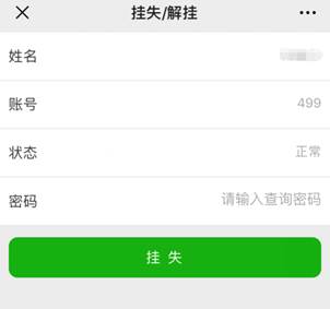 “挂失/解挂”应用,如一卡通卡片遗失可自行挂失,挂失时需输入查询密码,点击“挂失”按钮。