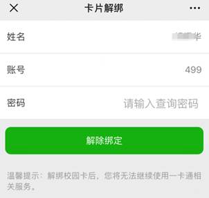 “卡片解绑”应用,如需绑定其他微信账号需先进行卡片解绑,输入查询密码点击“解除绑定”按钮完成解绑。