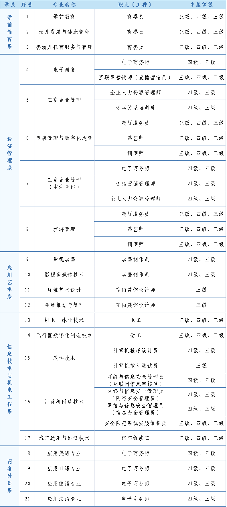 在本次申请的21个专业中,信息技术与机电工程系获批5个专业9项资质、学前教育系获批3个专业1项资质、应用艺术系获批4个专业2项资质、经济管理系获批5个专业13项资质、商务外语系获批4个专业1项资质。