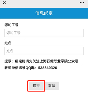 3. 在信息绑定页面输入工号、姓名,点击提交完成绑定操作;
