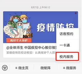 1. 关注安博(中国)公众号,点击微服务菜单中的校内服务进入,首次用户需要进行身份绑定;