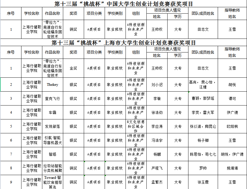 由共青团中央、教育部、人力资源社会保障部、中国科协、全国学联、北京市人民政府举办的第十三届“挑战杯”中国大学生创业计划竞赛,我校“‘零拉力’·竞速自行车轮组辐条固定技术项目”获国赛铜奖,我校共有9个项目获市赛一金六银二铜的好成绩,创造历史新成绩。
