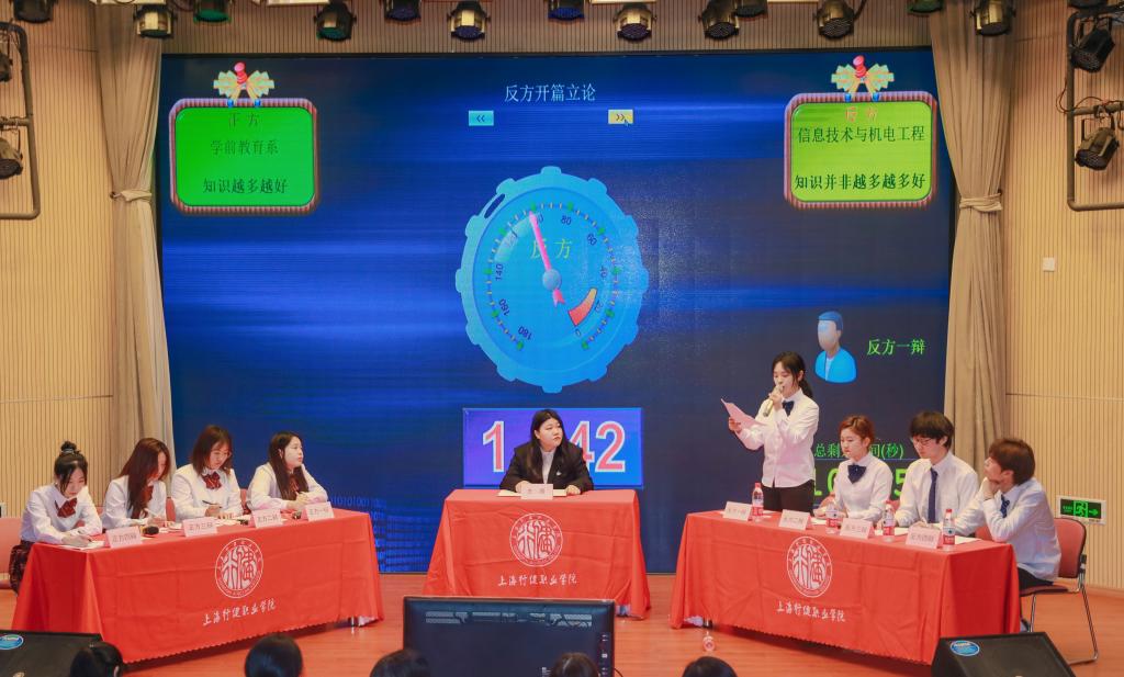 开幕式主持人向大家介绍了本届辩论赛的赛程安排、辩论规则、比赛流程及赛制安排后,本届辩论赛的第一轮第一场比赛正式开始。学校办公室主任徐沫扬、学校党委办公室主任曹娜、学校党委宣传部常务副部长任琳琳、学校思政部主任田春、学校教务处处长公晨担任本次首场辩论赛评委。首轮出战的队伍分别是正方学前教育系与反方信息技术与机电工程系。双方就“知识是否越多越好”这一辩题展开激烈的辩论。辩论场上双方各抒己见,选手们妙语连珠、针锋相对,为大家带来了一场精彩绝伦的比赛。经过评委们的激烈讨论与公正评分,最终正方学前教育系取得本场比赛的胜利。正方二辩姚传悦表现优越,获得本场比赛“优秀辩手”。
