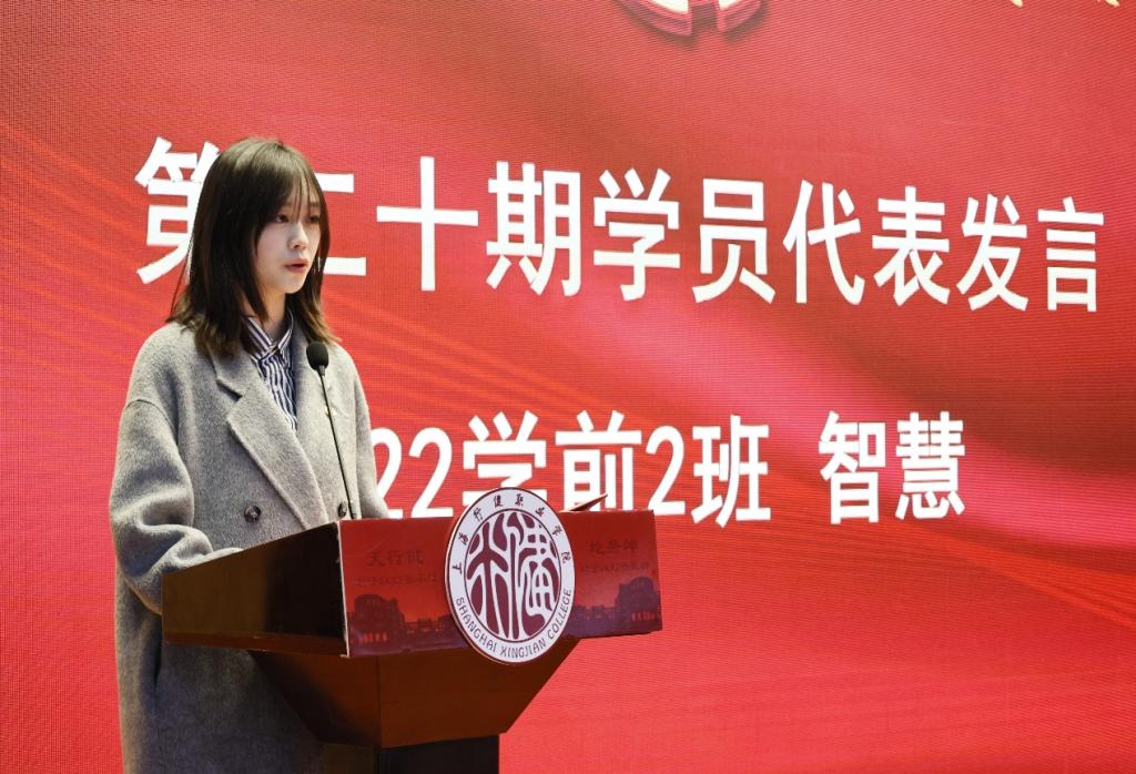 学前教育系22级学前2班智慧同学作为学员代表发言,她以亲身经历号召同学们在学习与实践中勇敢肩负起时代赋予的重任,志存高远,以强国有我的使命担当奉献青春力量。最后,仪式在全体团员共唱团歌中落下帷幕。