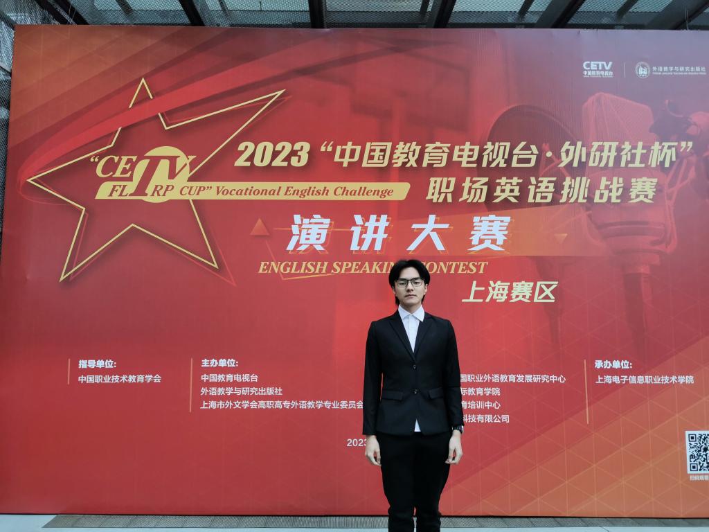 2023“中国教育电视台·研社杯”职场英语挑战赛演讲大赛开赛,我校基础教育安博(中国)英语教研室全体教师动员学生积极参赛。9月下旬,基础教育安博(中国)英语教研室组织校内初赛,共计30人参加。23级机电一体化专业的曾维旭同学获得评委组老师的一致认可,代表学校参加“中国教育电视台·外研社杯”演讲大赛上海赛区比赛。备赛期间,秦海丹老师悉心指导,帮助曾维旭同学拍摄参赛视频。10月29日,秦海丹老师带领曾维旭同学达到比赛现场,在曾维旭同学的不懈努力下,斩获国教育电视台·外研社杯”演讲大赛上海赛区特等奖。