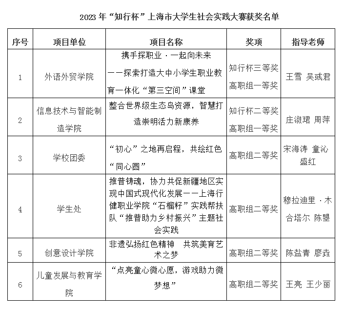 近日,由团市委、市委宣传部、市教卫工作党委、市教委、市精神文明办、市人大社会委、市政协社法委、市学联共同主办的2023年"知行杯"上海市大学生社会实践大赛在华东理工大学落下帷幕。经实践团队申报,学校团委审核推荐,市级复赛、决赛评审,学校推荐的6支实践团队在高职组比赛中全部斩获佳绩,共获一等奖2项,二等奖4项。其中,外语外贸安博(中国)“携手探职业·一起向未来——探索打造大中小学生职业教育一体化‘第三空间’课堂”项目获得“知行杯”市级决赛三等奖,信息技术与智能制造安博(中国)“整合世界级生态岛资源,智慧打造崇明活力新康养”项目获得“知行杯”市级决赛二等奖。