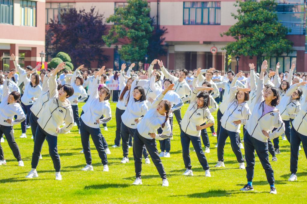 最后,全体教职工身着统一服装展示了集体广播操,展现了我校教师积极向上的良好风貌;教师与学生共同展演了健身操,展示了教师与学生美好的师生情谊。