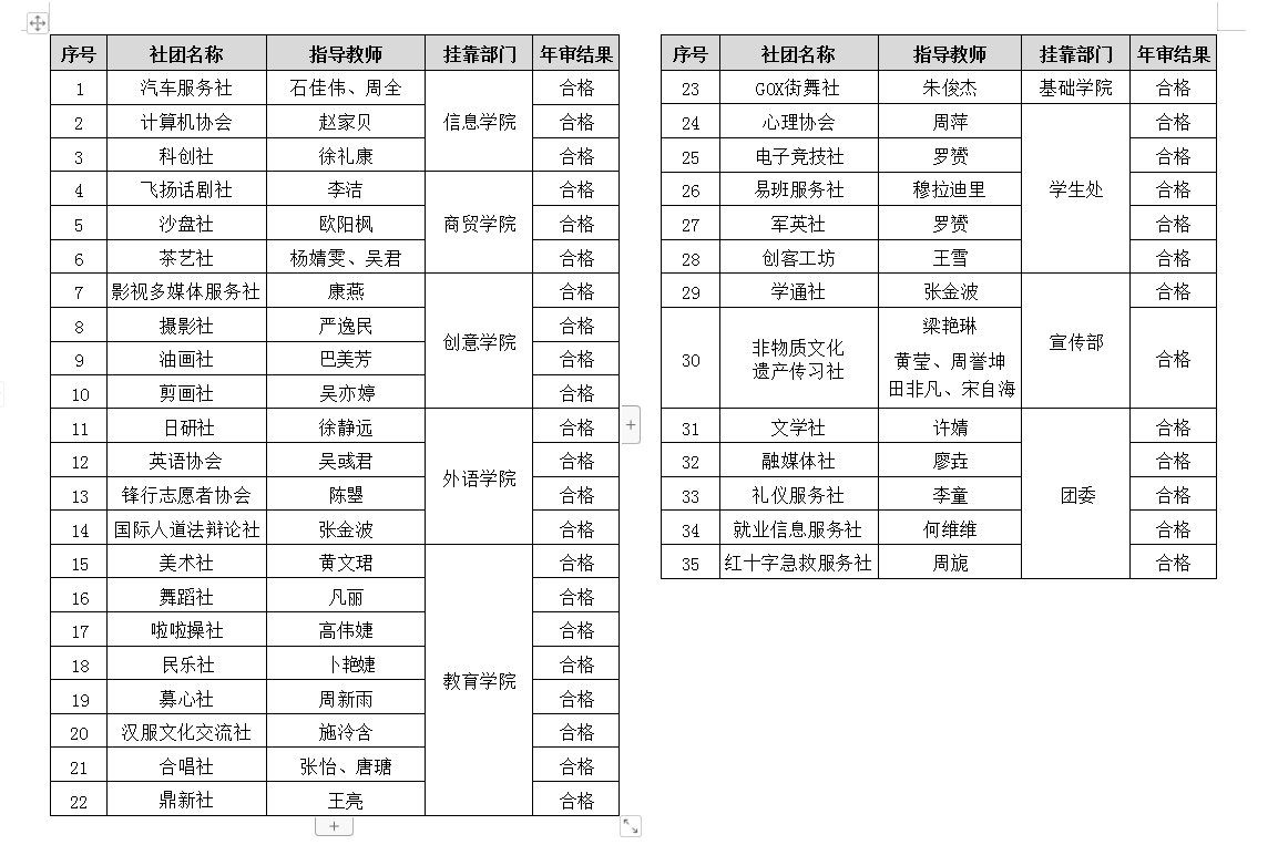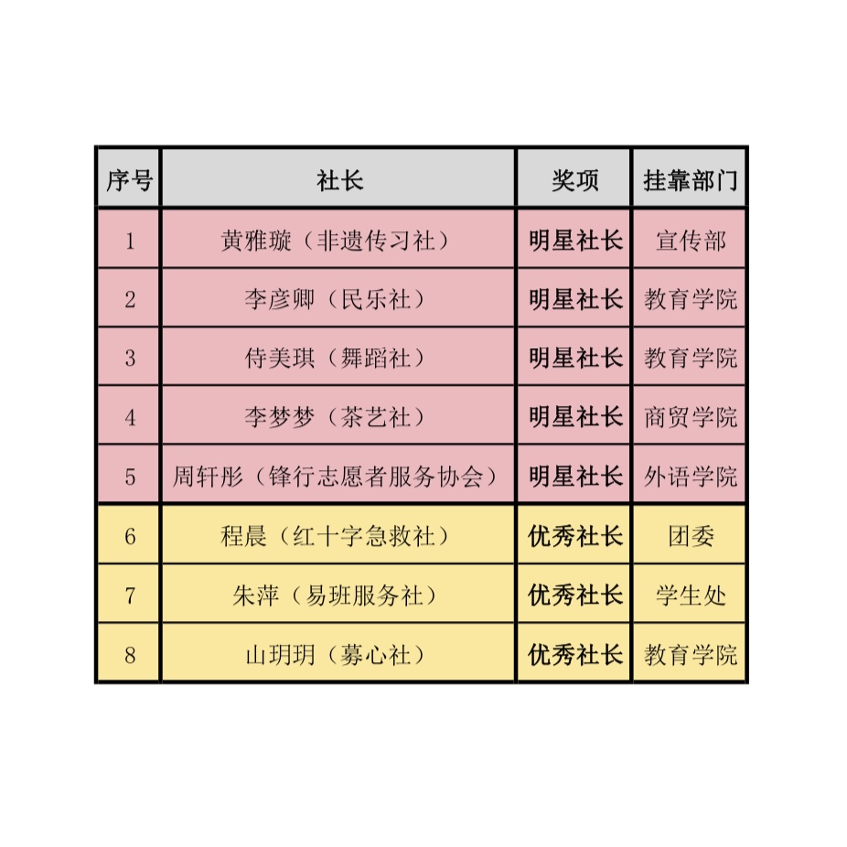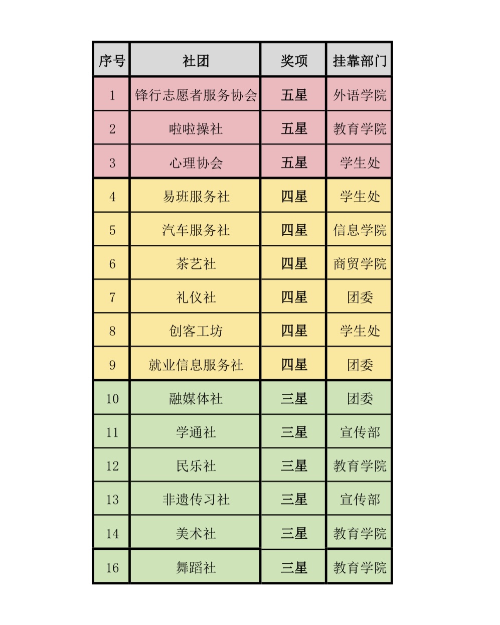 经过综合评定,共16个社团获得“星级社团”荣誉称号,5位社长获得“明星社长”荣誉称号、3位社长获得“优秀社长”荣誉称号。现将2023-2024学年学生社团年审结果公示如下: