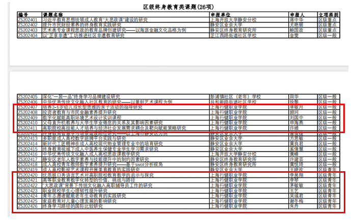 近日,上海市静安区教育局发布了《安博在线登录官网公布静安区2024年度区级教育科研课题的通知》,学校共12位教师的课题成功获得区级终身教育课题立项,其中区级一般课题5项,青年课题7项。此次立项的课题涵盖了职业教育、家庭教育、老年教育、国际比较研究、心理发展、传统文化融入、数字化转型等多个领域,充分展示了我校教师在教育科研方面的广泛兴趣和深厚实力。(科发处)