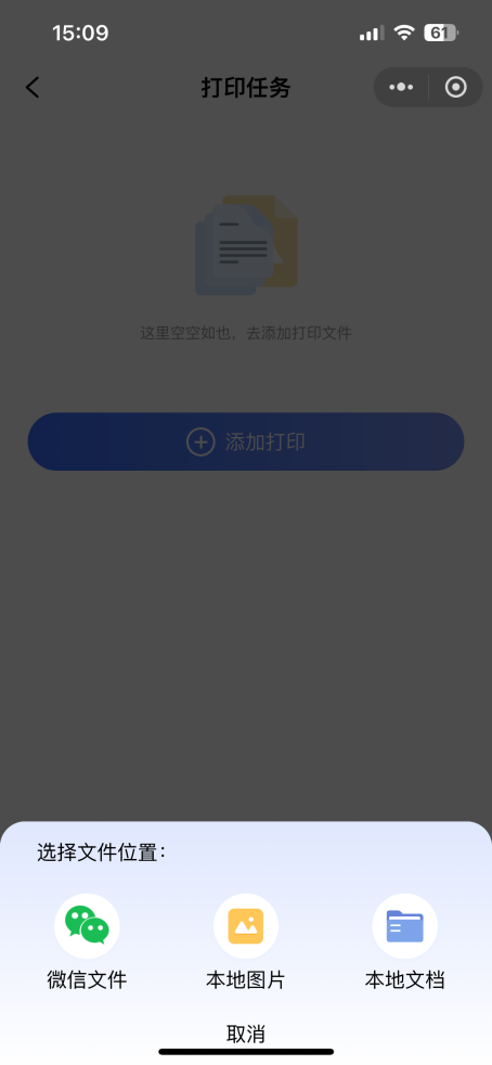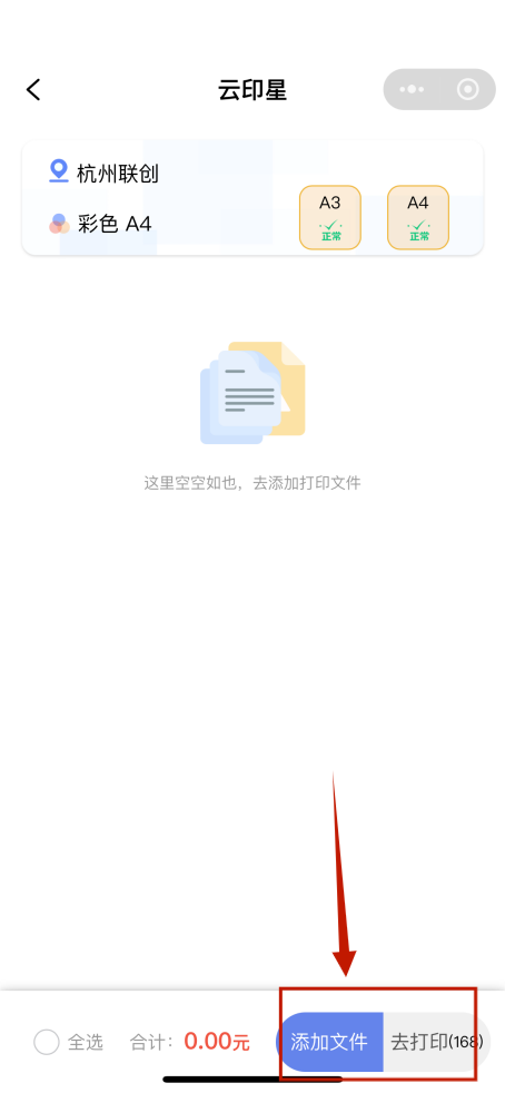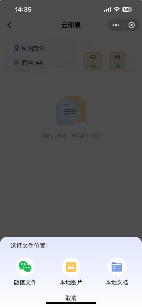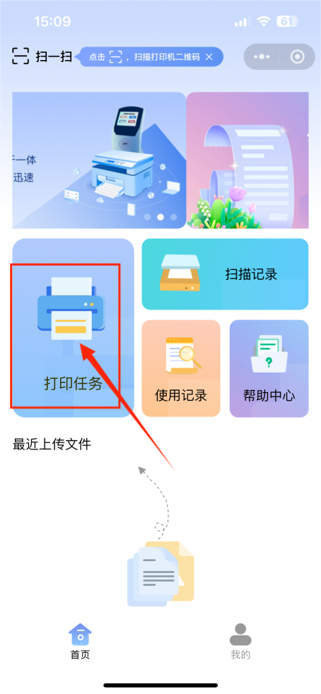 (1)文件上传:微信搜索并添加“云印星”微信小程序,然后打开“云印星”小程序,点击“打印任务”,然后根据界面提示选择文件并上传。如下图所示