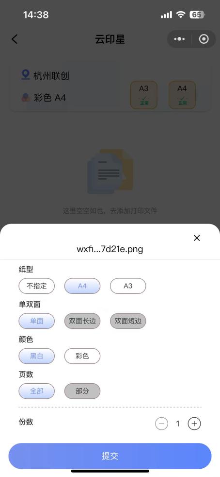 (1)点击屏幕上的“打印”按钮,使用微信扫描屏幕二维码进入文档上传界面,点击“添加文件”进入文档选择界面,然后选择打印的文件属性(纸型、单双面、颜色、页数、份数等),选择完毕点击“提交”并进行费用的支付,支付完毕一体机自动输出打印的文档,如下图所示。