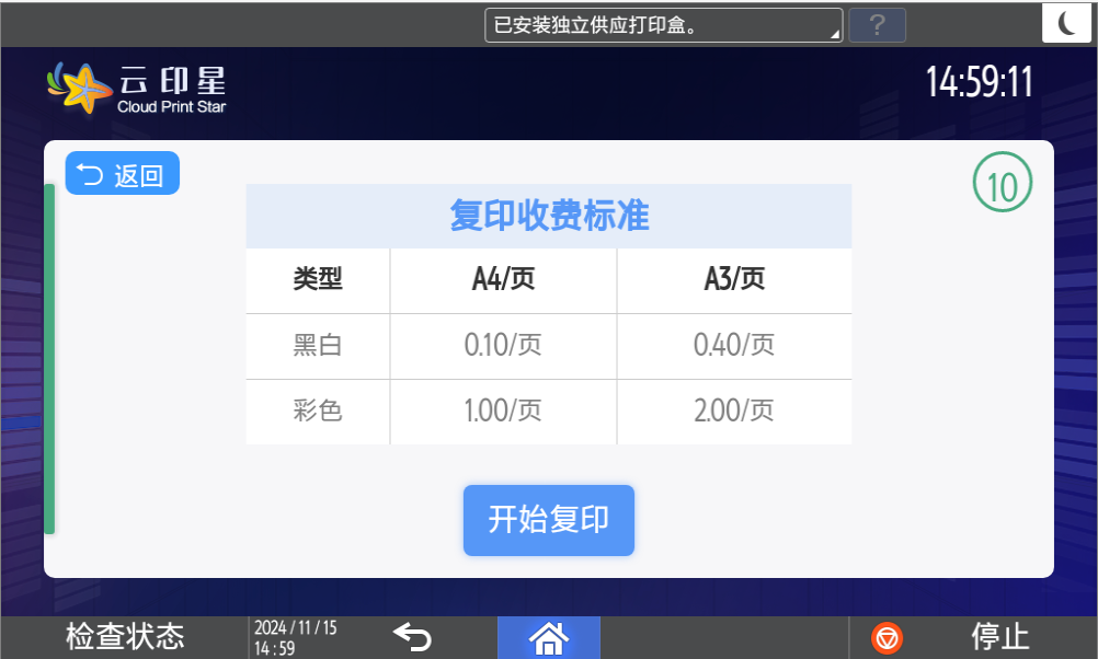 (2)点击一体机屏幕上的“复印”按钮,显示复印收费标准,如下图所示,点击“开始复印”。