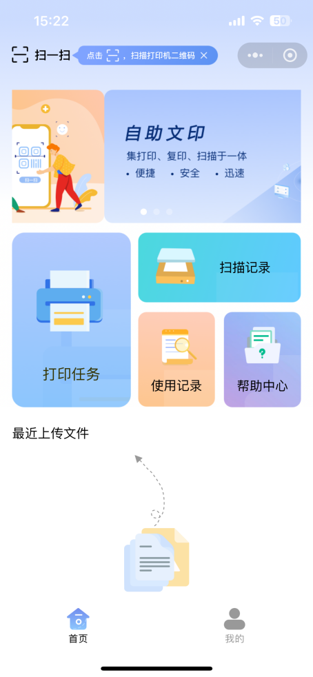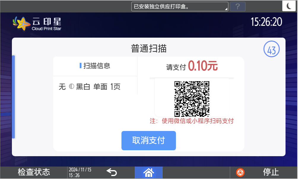 (2)现场扫码:在一体机屏幕上选择“打印”,然后扫描屏幕二维码完成费用的支付,费用支付完毕一体机输出所打印的文档。