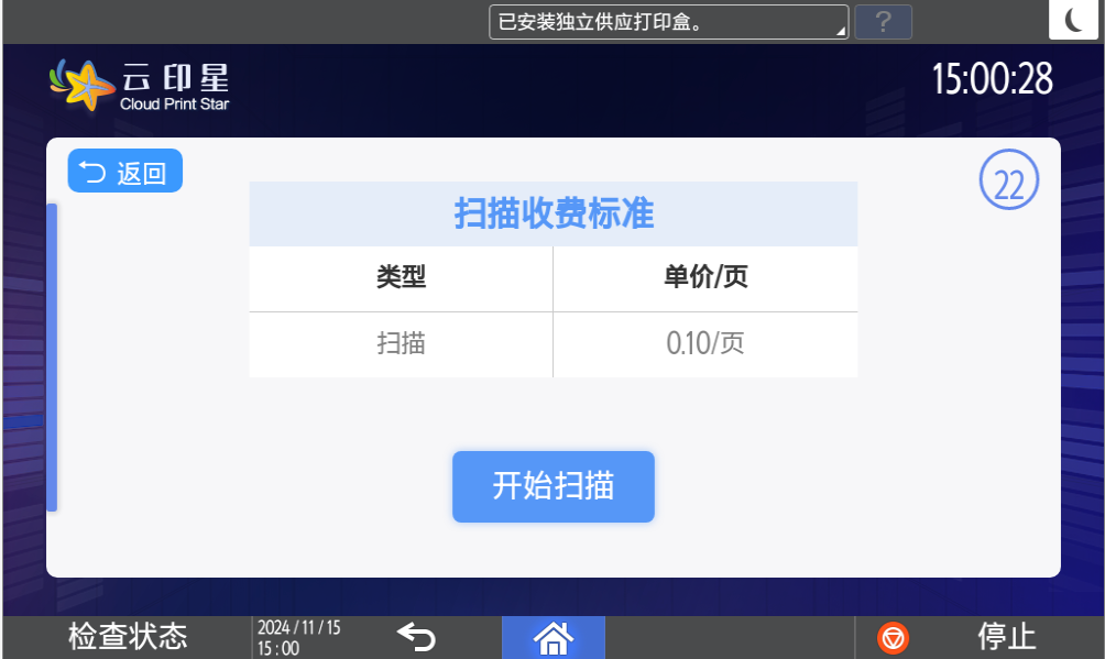 (1)点击一体机屏幕上的“扫描”按钮,屏幕显示扫描的收费标准,如下图所示