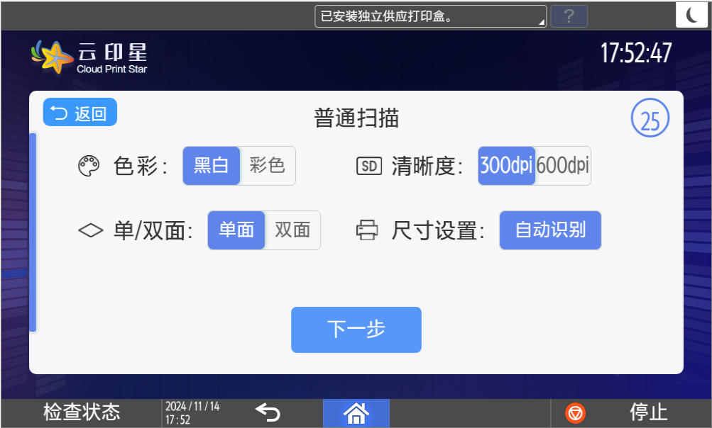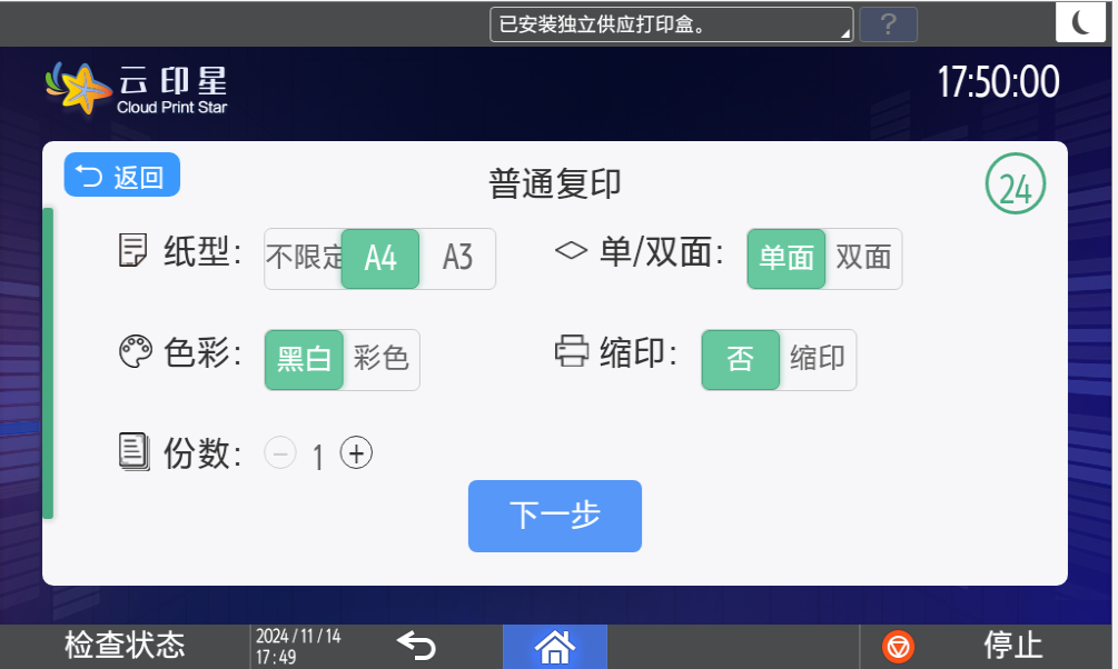 (4)根据需要选择复印的属性,包括纸张类型、单双面、色彩、分数,是否缩印等,然后点击“下一步”,如下图所示