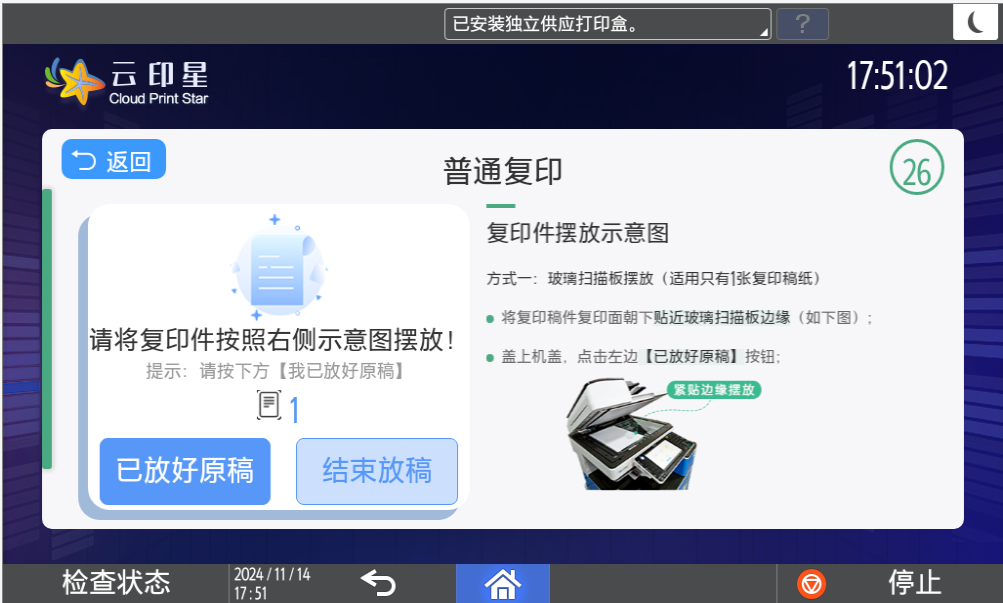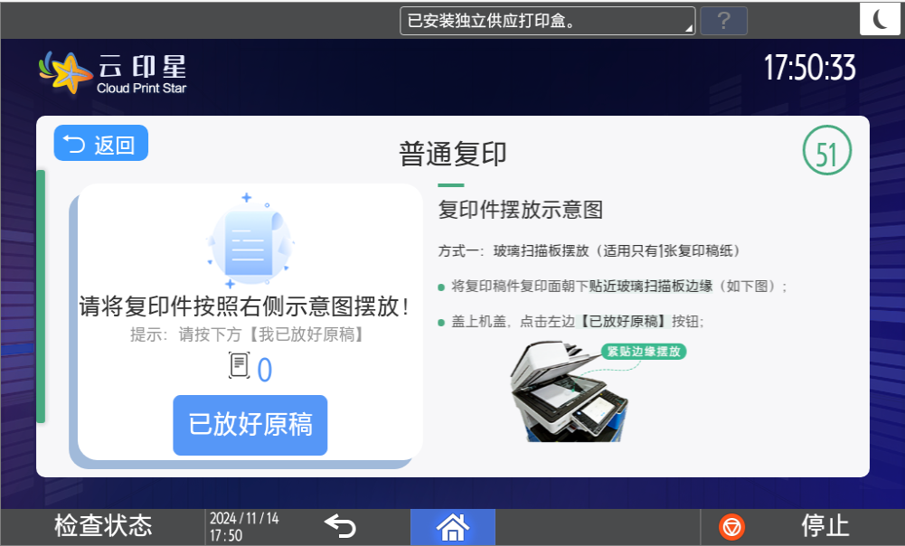 (5)若复印的原稿已放置好,点击一体机屏幕上的“已放好原稿”,如下图所示