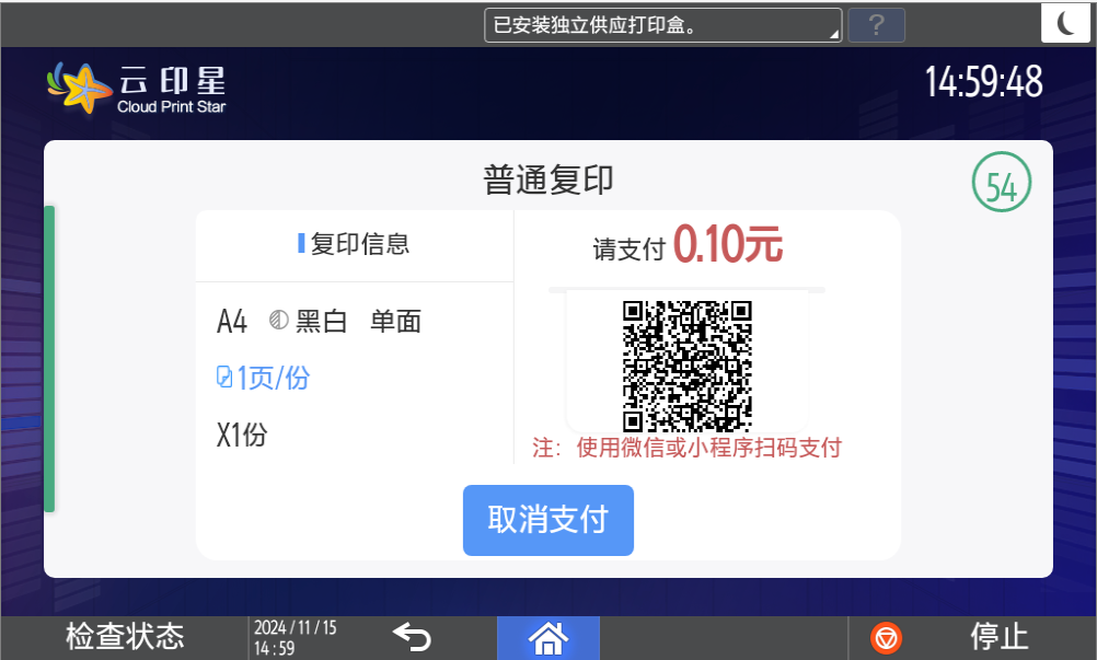 (7)屏幕界面显示此次复印所需费用,微信扫码进行支付,支付完毕则一体机输出所复印的文件,如下图所示。