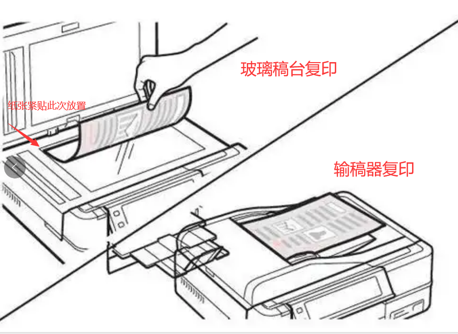 (1)复印前先在一体机上放好需要复印的原稿,若原稿是标准的A3和A4纸,可通过一体机的输稿器进行复印,若原稿是非标准的A3和A4纸,只能将原稿放置在一体机的玻璃面板上复印,纸张放置如下图所示。
