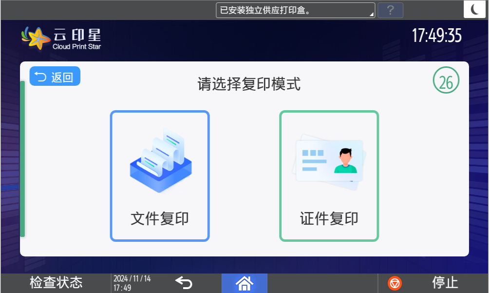 (3)选择需要复印的文件类型,可选择文件复印和证件复印,普通的复印选择“文件复印”即可,身份证等证件复印选择“证件复印”。如下图所示