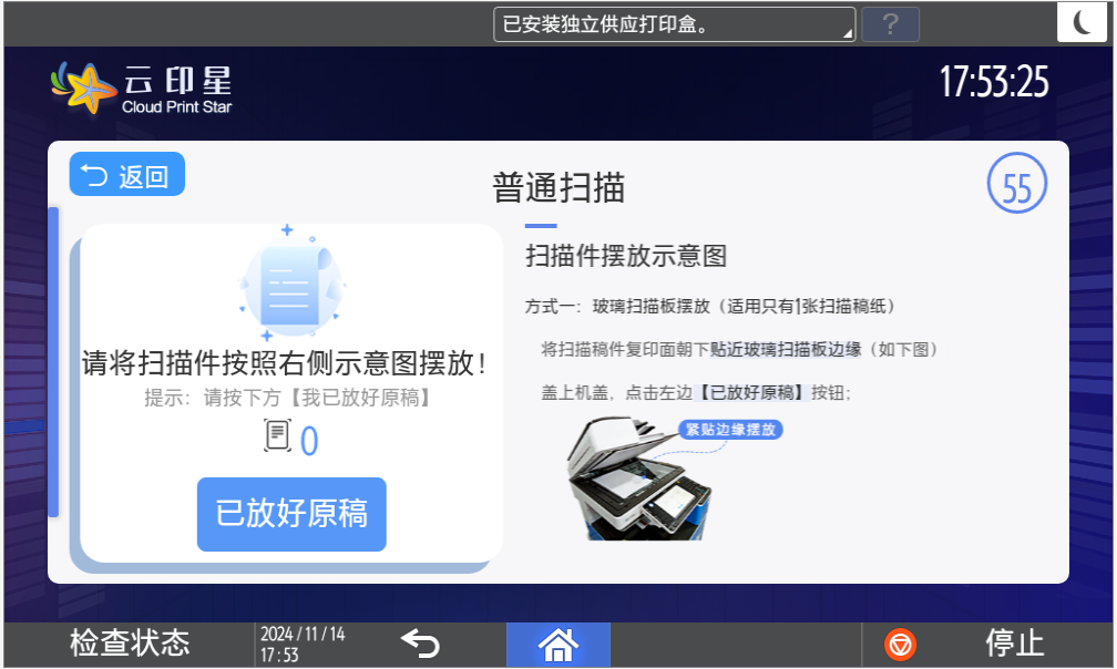 (3)在一体机上放置需要扫描的原稿,放置方式跟复印一致,原稿放置完毕点击“已放好原稿”,如下图所示。