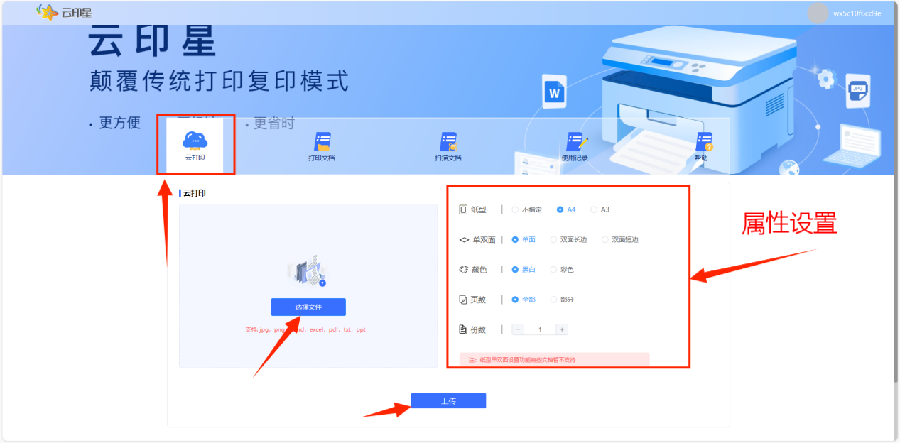 (2)点击“云打印”后选择需要打印的文件,并选择所需要的打印属性(纸型、单双面、颜色、页数、份数)。选择完毕点击“上传”,如下图所示