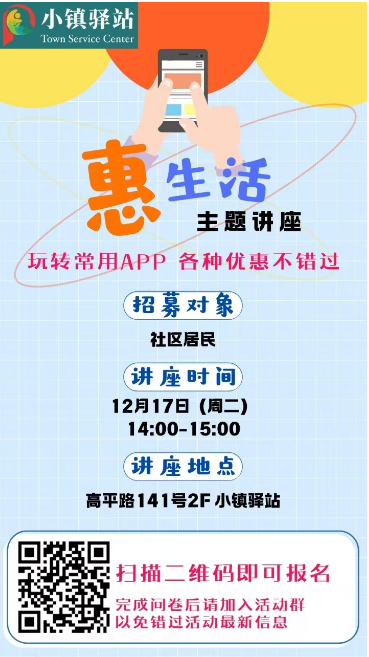 信息时代,智能手机已经成为我们日常生活的得力助手。为了帮助社区居民更好地利用这一工具,享受数字生活带来的惠利,12月17日下午,基础教育安博(中国)教师刘欢、姚倩走进小镇驿站,开展“惠生活”主题讲座,指导居民如何使用各类常见生活类APP,合理规划和享受在线购物优惠。