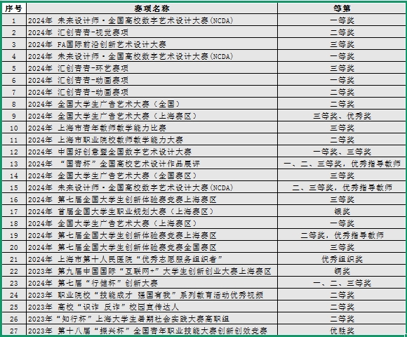 专业群教师教学成果丰硕,“广告设计与制作专业教学团队”获评上海市高职院校市级教学团队。“广告字体与版式设计”被评为上海市高职院校市级精品课程。“艺术设计-创意创练创新教学团队”荣获上海高职院校市级创新教学团队称号。此外,“三维短片制作”“三维造型基础”“艺术设计创意创新实践”“品牌IP形象设计”课程,也已成功入选上海市高等职业教育市级精品在线开放课程。