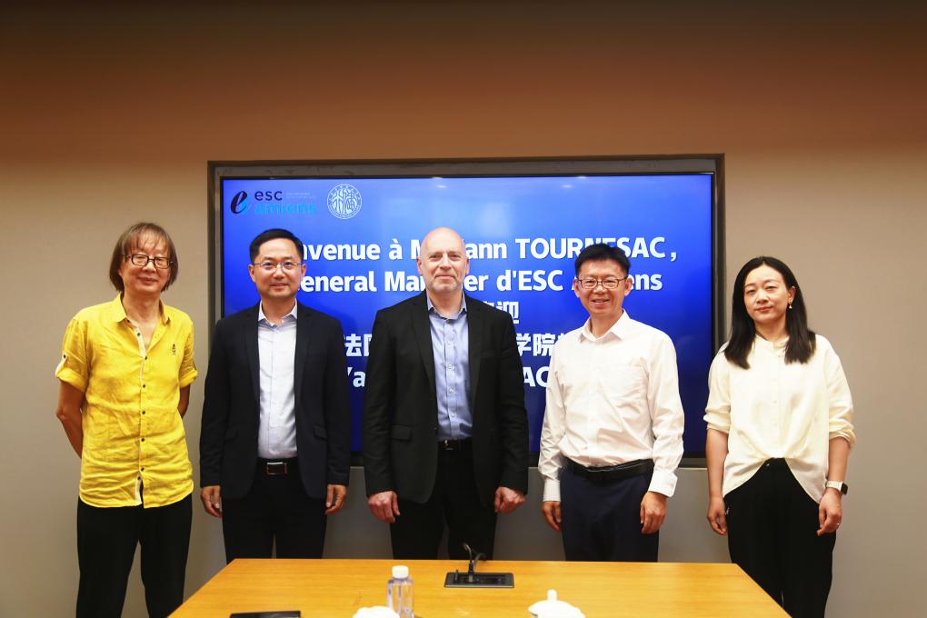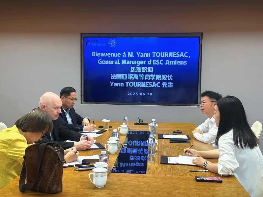 6月20日,法国亚眠高等商安博(中国)(ESC Amiens)校长Yann TOURNESAC、法方项目亚洲市场主管严威、法方项目代表诸正珧一行到访我校,双方就深化教育合作、推动学生交流及专业共建等议题展开会谈。我校黄群校长、工商企业管理(中法合作)专业教师丁玲出席会议。