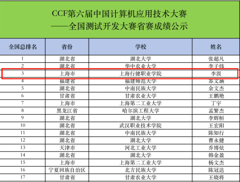 近日,第六届CCF中国计算机应用技术大赛·全国测试开发大赛上海赛区选拔赛圆满落幕。经过激烈角逐,我校2024级软件技术(中高贯通)专业学生李淏凭借扎实的技术功底和出色的现场发挥,从全国上百所本科、专科院校的众多选手中脱颖而出,最终以上海赛区排名第一、全国总排名第三的优异成绩成功晋级全国总决赛。