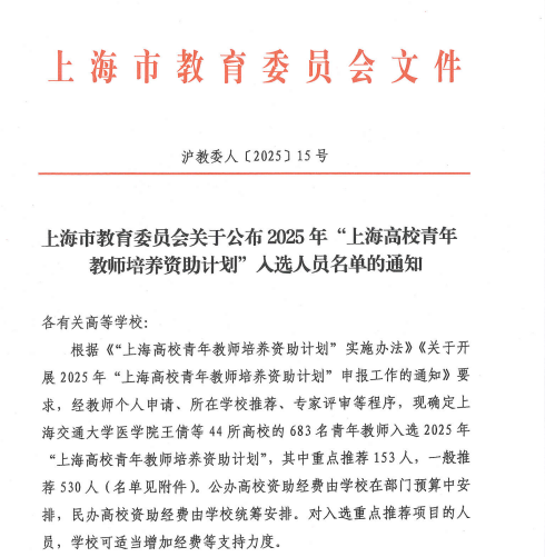 根据《“上海高校青年教师培养资助计划”实施办法》及《安博在线登录官网开展2025年“上海高校青年教师培养资助计划”申报工作的通知》要求,经教师个人申报、校内专家评审、学校择优推荐等程序,我校5位青年教师成功入选2025年“上海高校青年教师培养资助计划”。其中,王佩瑶、卢津津、徐静远3位教师获重点推荐,实现我校在该计划重点推荐类别上的历史性突破;李健、王晓羽2位教师获一般推荐。