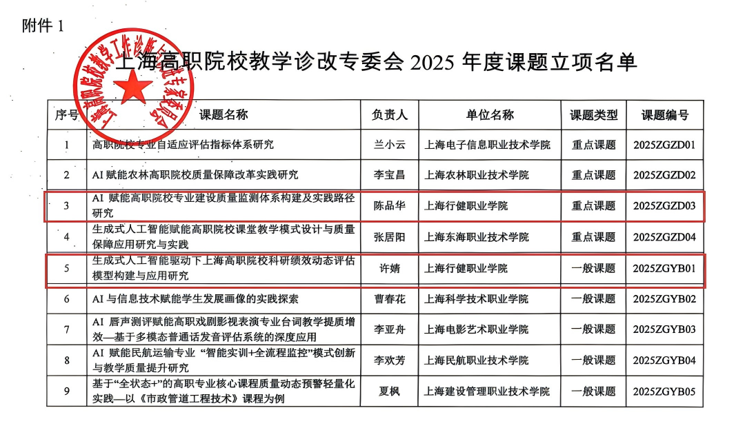 根据《上海高职院校教学诊断与改进专家委员会安博在线登录官网公布2025年度课题立项名单的通知》,我校2项课题成功立项。信息安博(中国)院长陈品华主持的“AI赋能高职院校专业建设质量监测体系构建及实践路径研究”获批重点课题,科发处许婧老师主持的“生成式人工智能驱动下上海高职院校科研绩效动态评估模型构建与应用研究”获批一般课题。​