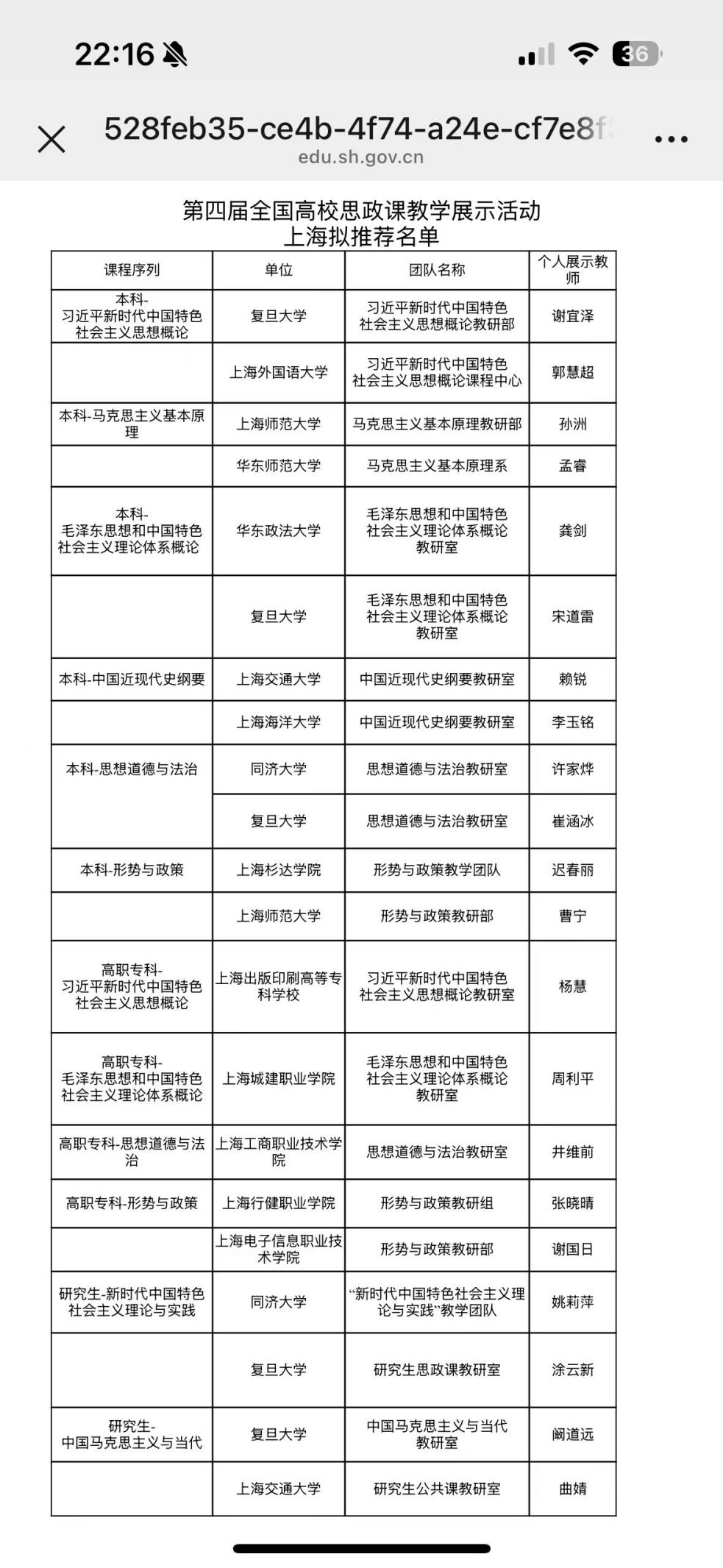 2025年7月31日,上海市拟推荐参加第四届全国高校思政课教学展示活动的教学团队名单正式公布。我校“形势与政策”教学团队成功入选,成为代表上海市参加全国展示活动的高职高专院校团队之一,充分彰显了我校思政课建设的阶段性成果与教师队伍的专业实力。