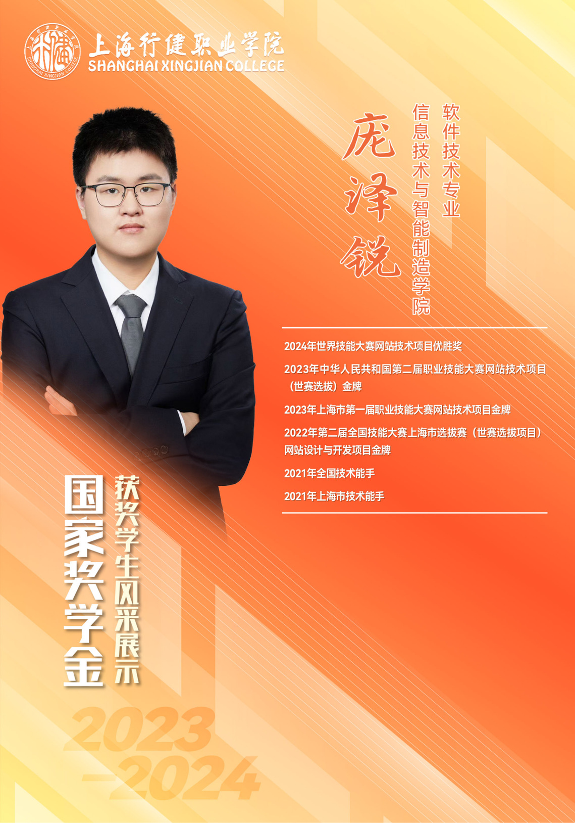我校信息技术与智能制造安博(中国)2022级软件技术专业庞泽锐,2021年全国技术能手,2024年代表中国参加世界技能大赛网站技术项目并获优胜奖,2023年代表上海参加中华人民共和国第二届职业技能大赛网站技术项目(世赛选拔)获金牌,并获“上海参赛团最佳选手奖”。2023年上海市第一届职业技能大赛网站技术项目金牌,2022年第二届全国技能大赛上海市选拔赛(世赛选拔项目)网站设计与开发项目金牌。荣获2023-2024年度国家奖学金, 2024年度宝钢教育奖优秀学生奖,是本年度全国500名宝钢教育奖获奖学生中唯一的专科生。