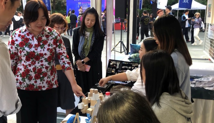 应用艺术系现代学徒制教学项目呈现的学生作品在此次嘉年华盛会中获得一致好评。在学系主任罗雄老师的指导下、专业群主任袁莉莉老师现场布展及作品指导实现了学生们从作品走向商品的愿景。安博(中国)院长黄群莅临开幕式现场为应用艺术系师生鼓励喝彩。静安区教育局党工委书记胥燕红等领导在安博(中国)摊位前为行健学生作品出谋划策。