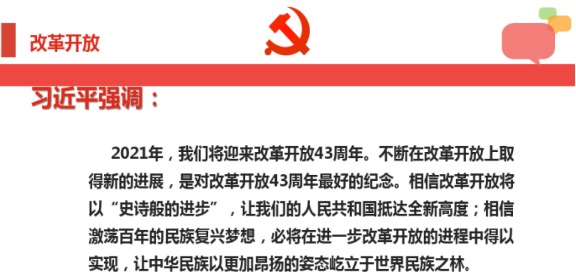 1978年,我们党召开具有历史重大意义的十一届三中全会,会议确定了“解放思想,开动脑筋,实事求是,团结一切向前看”的指导方针,从而开启了改革开放“航船”的新征程,使社会主义中国进入了新时期、新发展。从那时起,我们党带领全国各族人民迈向了自强不息的“复兴之路”,抒写了生机盎然的“春天故事”,谱写了蓬勃发展的“壮丽史诗”。