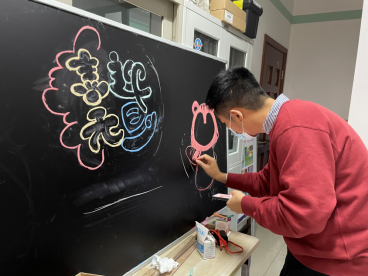 党史学习教育开展以来,艺术系支部与高平路美景雅苑小区建立了共建关系本学期初,艺术系支部与美景雅苑小区开展了“扮靓家园 环境美化”活动。应社区党总支书记潘毅文的邀请,11月24日,艺术系支部邝姗、巴美芳、李昊翔、廖垚前往美景雅苑小区出一期主题为“庆祝元旦”的黑板报。