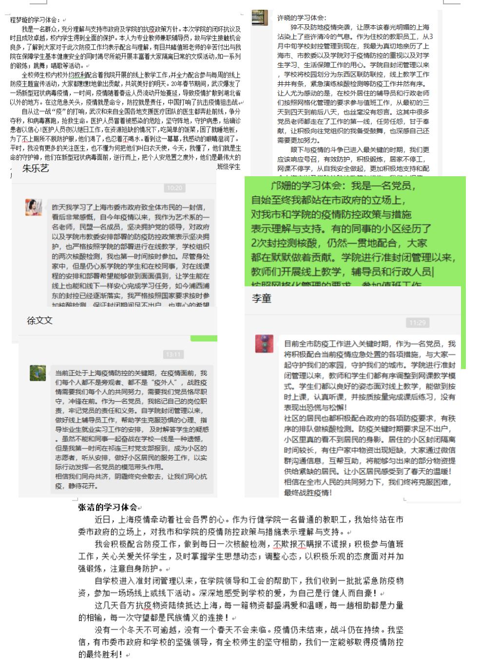 通过学习,教职工认识到,上海作为一个拥有2500万常住人口的超大城市,要顺利完成全员核酸筛查、早日打赢疫情防控阻击战,离不开每一位市民朋友的支持配合。市委市政府给为抗疫而努力的每一个我们带来安心与感动,大家都相信,坚持就是胜利,我们必将战胜疫情拥抱春天。 (艺术系 邝姗)