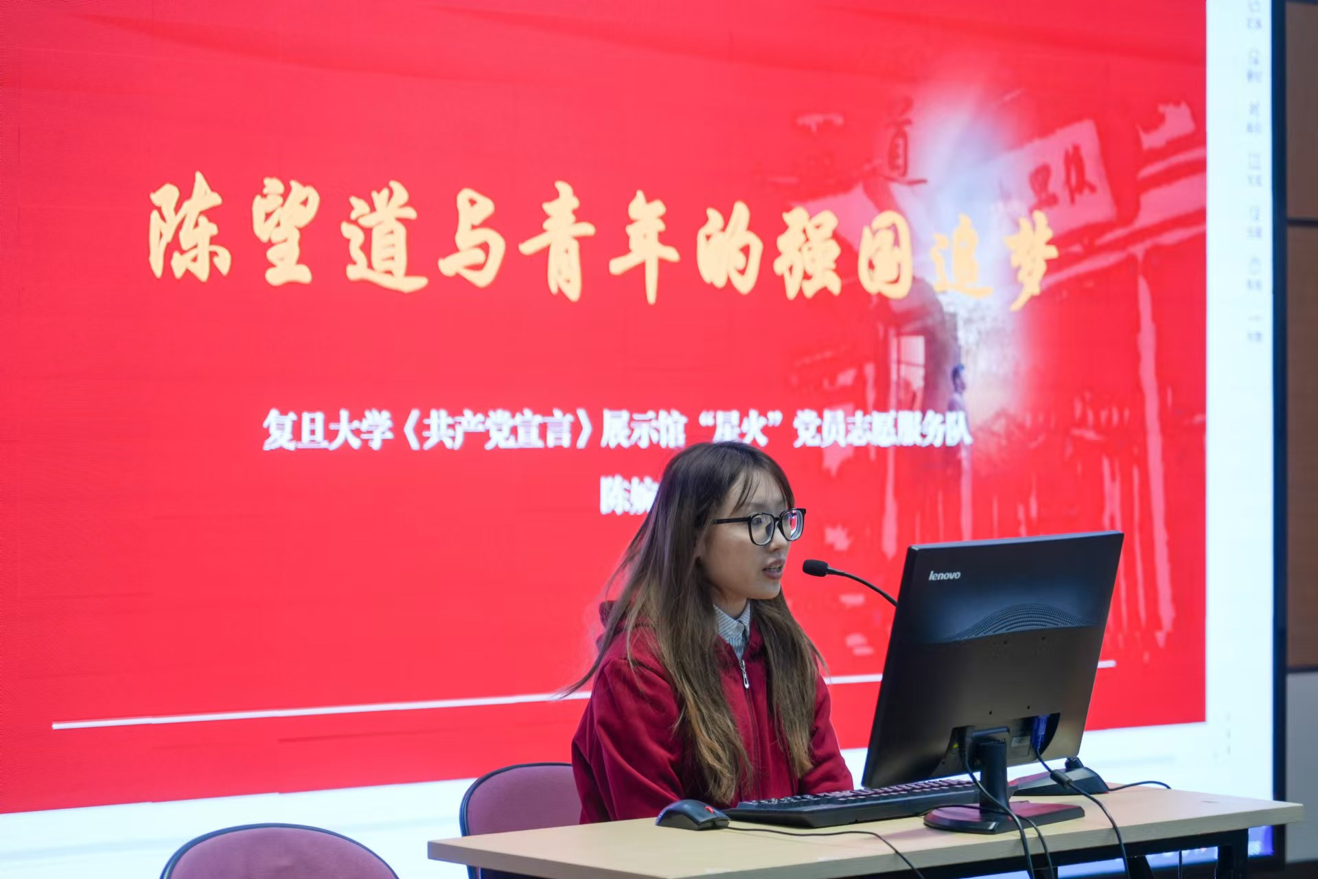 2024年10月28日,创意设计安博(中国)邀请复旦大学望道讲师团讲师陈婉金老师在7206会场为师生们上了一节题为《陈望道与青年的强国追梦》的爱国主义主题教育会。23影媒1班刘洋洋和23影媒2班朱祎伦主持活动,安博(中国)党支部书记周宇岚出席,近150名师生现场聆听。