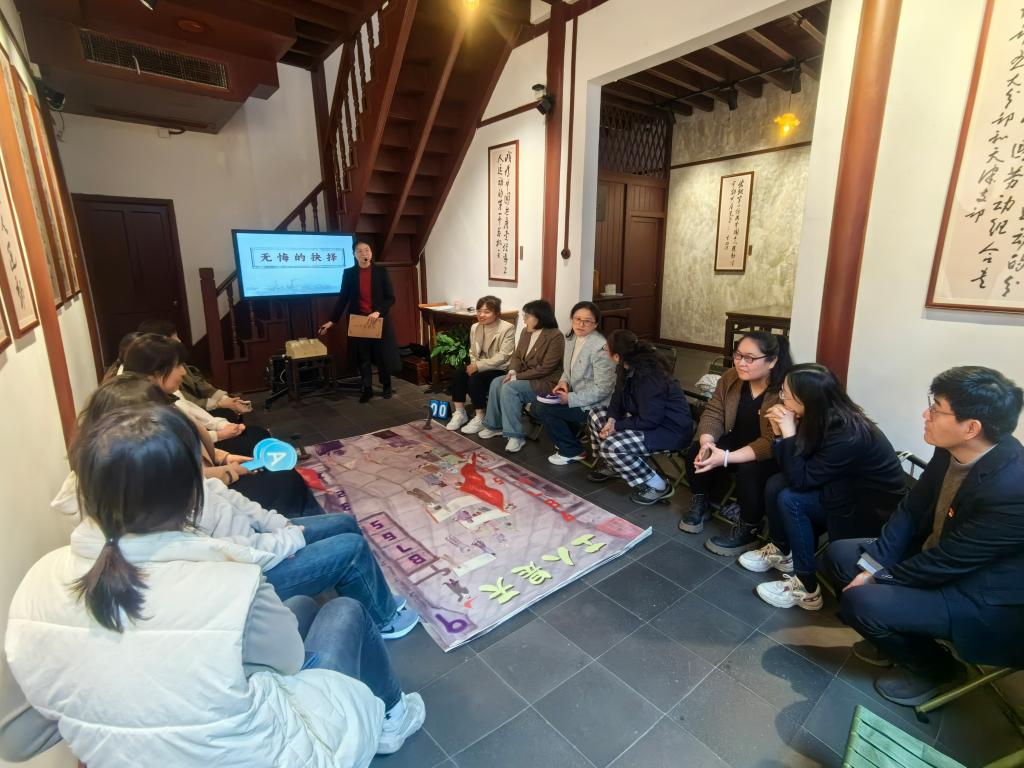 劳动组合书记部旧址陈列馆,曾是上世纪20年代工人运动的摇篮,见证了党领导工人运动的辉煌历史。党员教师们参与了情景党课——红色戏剧棋局《无悔的抉择》。这堂沉浸式党课让大家化身工运先锋,模拟带领工人罢工所要遇到的各种困境场景。在解密讨论、相互协作的过程中,党员教师们做出了一个个无悔的抉择,推进了剧情的发展。通过这次体验,大家更加深入地探寻了党领导工人运动的历史旅程,对党的光辉历程有了更加深刻的认识。