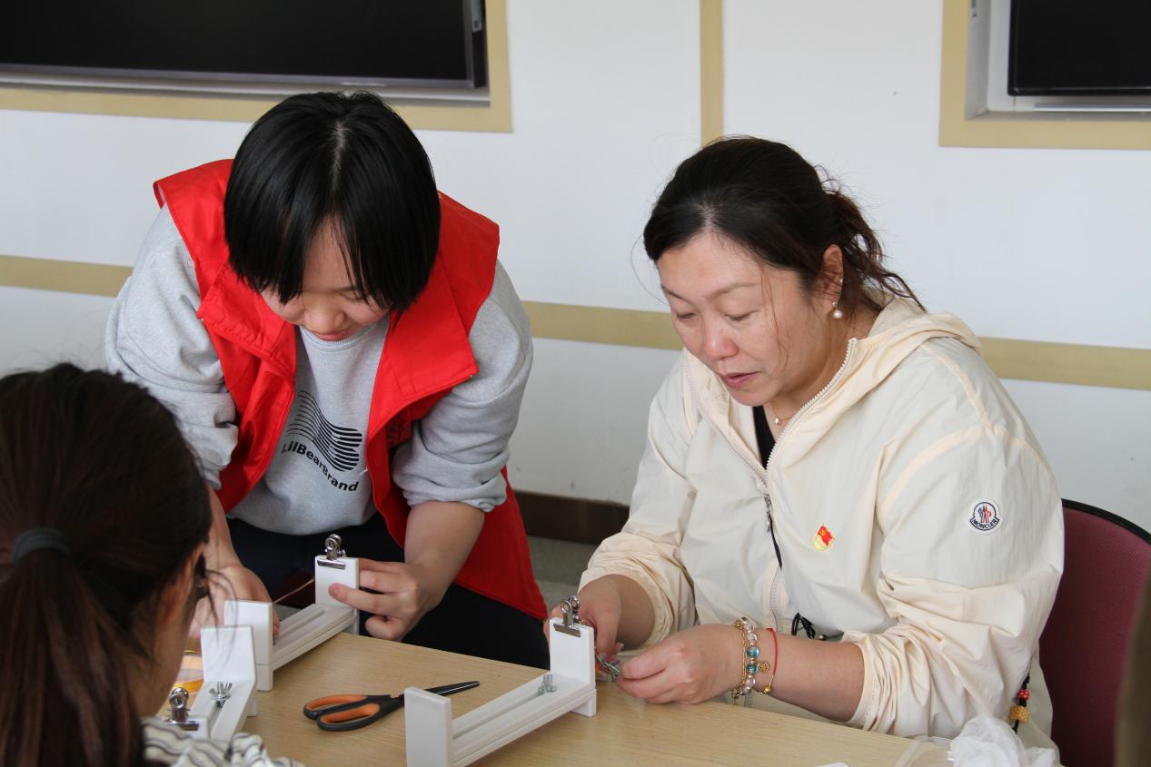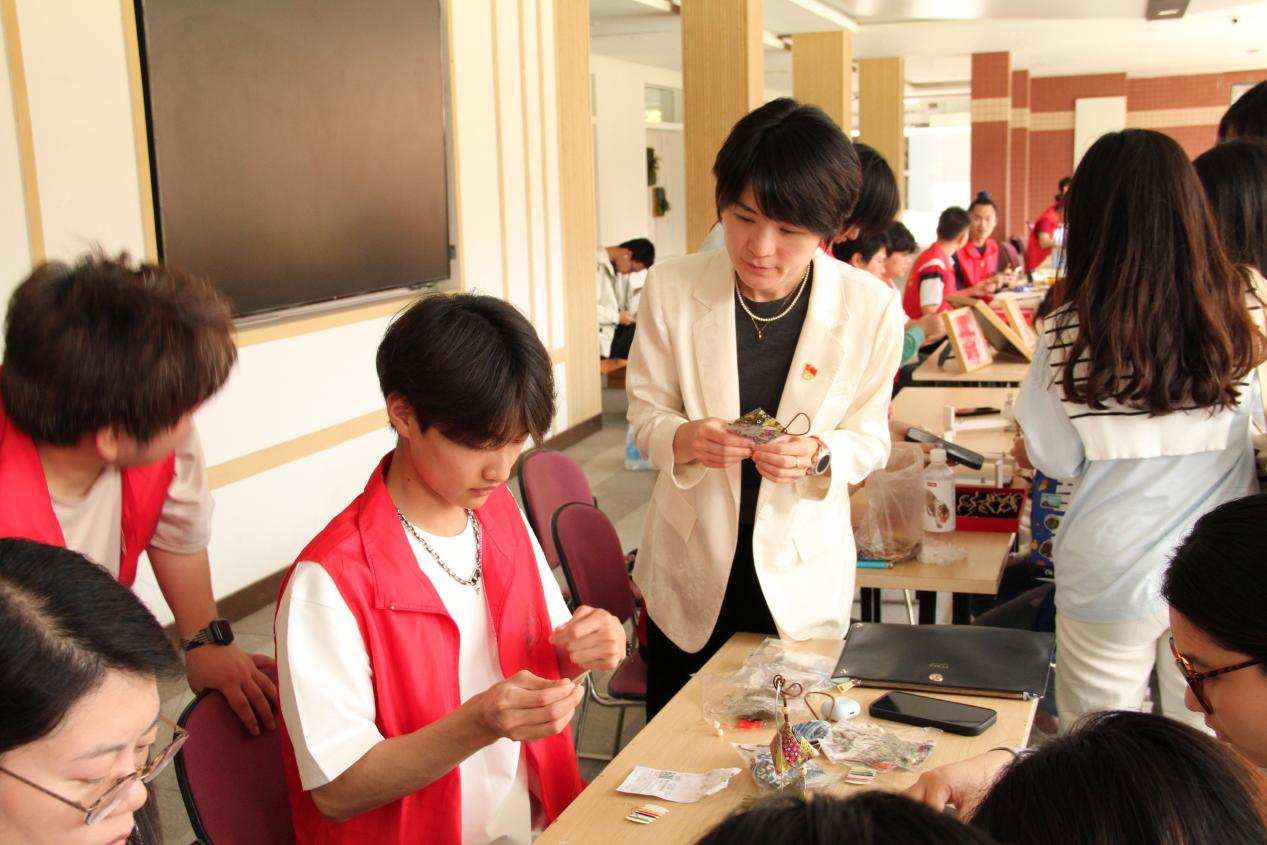 活动现场,党员教师耐心指导学生穿针引线、填充香料,和同学共同探讨传统香囊制作技艺;编织手绳时,示范复杂绳结的编织方法,鼓励学生发挥创意;刺绣与剪纸项目中,面对学生的困惑,党员教师结合自身经验,帮助学生完成精美作品。