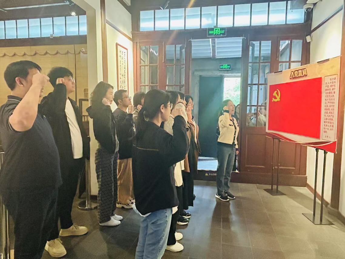 在中国劳动组合书记部旧址,馆内通过浮雕、蜡像、场景复原、多媒体演示等形式,生动呈现其诞生背景、组织架构等。在红色经典印迹志愿者讲师丁沪老师的串联讲解下,大家聆听党史故事,深刻感受革命先辈为工人权益、社会进步不懈奋斗的坚定信念,接受深刻革命教育与思想洗礼。党员们面对党旗庄严宣誓,重温入党初心与使命;团学干部也深受感染,纷纷表示要以党员为榜样,传承红色基因,勇担时代使命。
