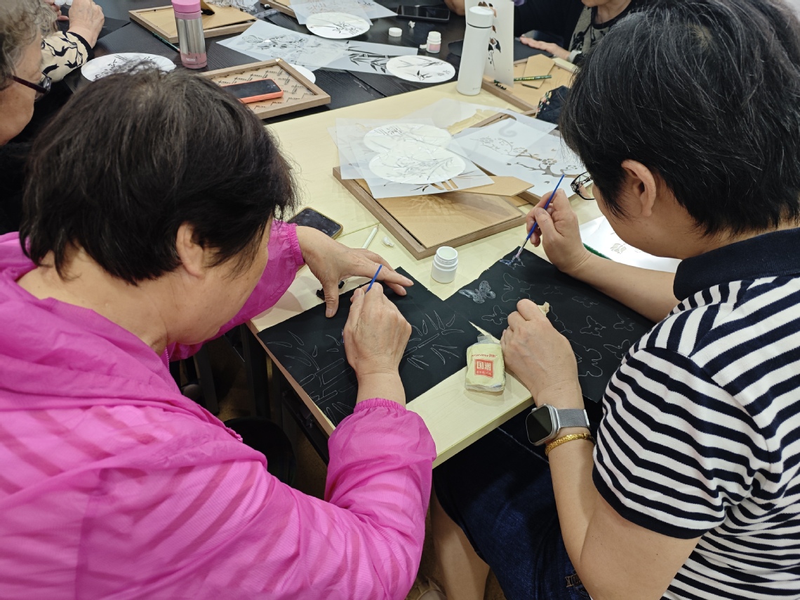 “烧箔画最重要的是涂胶,决定了轮廓和最终效果”,伴随着黄老师的耐心讲解,社区居民们屏息凝神,纷纷在已经成型的线稿上小心落笔,谨慎涂胶。二十名社区居民在黄老师的指导下,亲手体验“火与金”的艺术碰撞,从描线到贴箔,现场一片“箔”光粼粼。支部的4名志愿者教师也不闲着,一一指导,手把手助力。