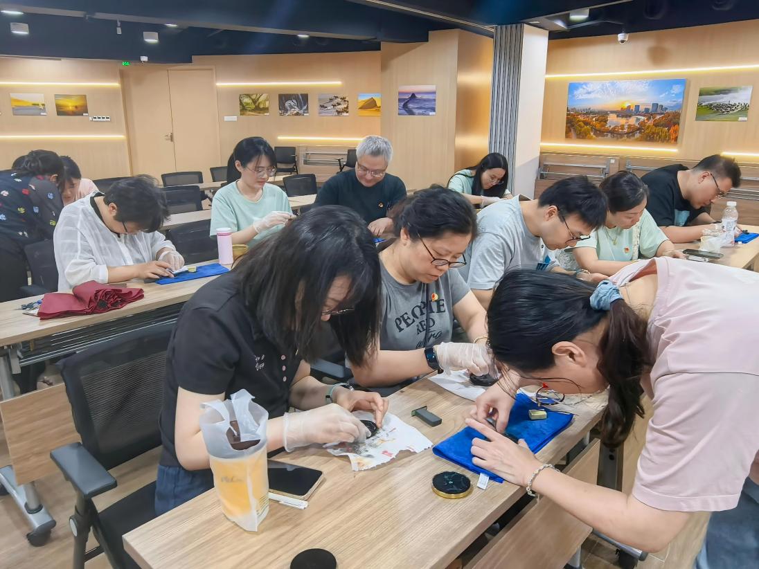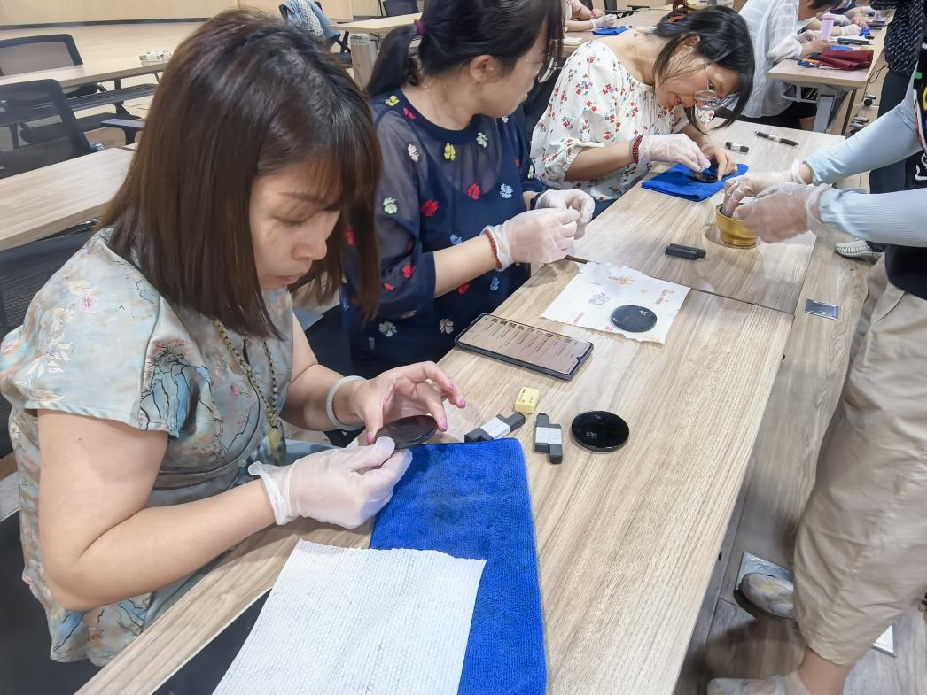 活动的另一大亮点是非遗体验大漆螺钿活动。在非遗大师黄莹老师的指导下,老师和同学们共同体验大漆螺钿工艺,感受传统非遗文化的魅力。大家亲手研磨、镶嵌,在实践中体会匠心精神,传承传统文化,将非遗技艺与红色教育相结合,赋予活动更深刻的内涵。